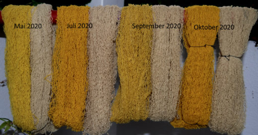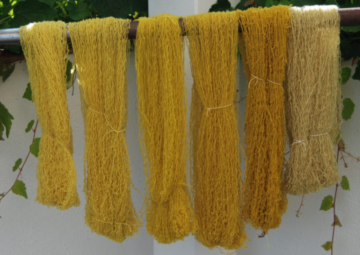 Hallo ! Die kanadische Goldrute färbt sehr ergiebig! Hier 5 Züge aus der gleichen Flotte von rechts nach links, ganz rechts wieder ohne Beize! lG Kiernan