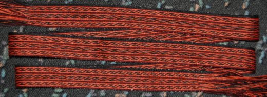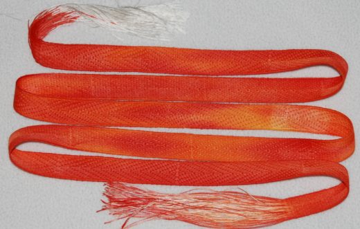 Dieses ursprünglich in weißer Seide gewebte Lochmusterband wurde nachträglich gefärbt, leider habe ich die mögliche Farbverteilung durch das Muster unterschätzt und so wurden aus drei Farben (rot/gelb/orange) ein fast einfarbenes Band! lG Kiernan